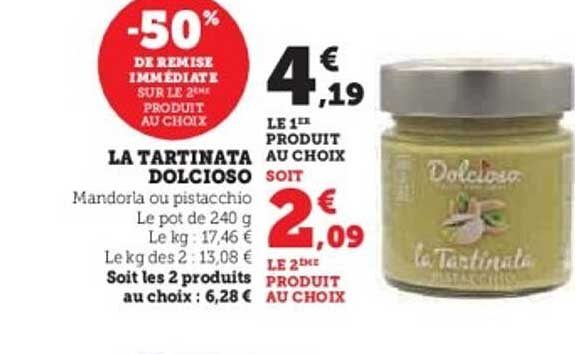 Découvrez la promotion exceptionnelle sur la Tartinata Dolcioso, un délice à base de mandorle ou de pistache, qui ravira vos papilles. C'est le moment parfait pour faire le plein de saveurs tout en faisant des économies.