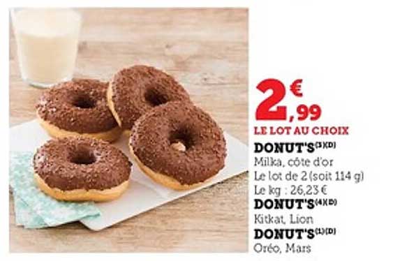 Découvrez une promotion irrésistible sur les donuts ! Profitez de l’offre exceptionnelle de Hyper U où vous pouvez choisir parmi plusieurs saveurs délicieuses. Que vous soyez fan de Milka, KitKat, Lion, Oreo ou Mars, il y en a pour tous les goûts. Cette offre est valable jusqu'au 2 novembre 2025, alors ne manquez pas l'occasion de vous faire plaisir avec ces douceurs.