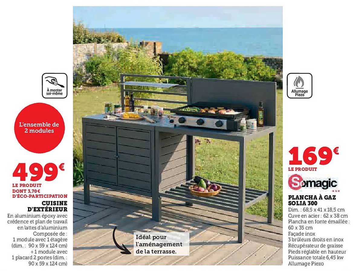 Découvrez une promotion incroyable sur les équipements d'extérieur avec cet ensemble de cuisine d'extérieur proposé par Hyper U. Parfait pour profiter des beaux jours, cette cuisine en aluminium allie fonctionnalité et esthétique, idéale pour vos barbecues entre amis ou en famille.