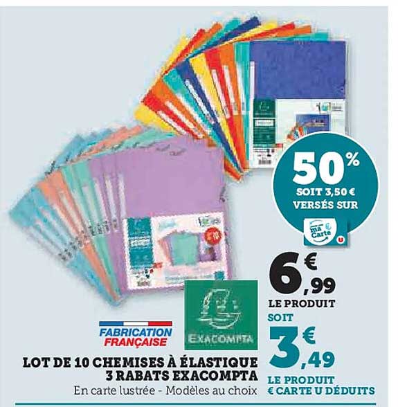 Découvrez dès maintenant la offre LOT DE 10 CHEMISES À ÉLASTIQUE 3 RABATS EXACOMPTA dans le catalogue de Hyper U. Cette offre est valable du 07/01/2025 au 19/01/2025.
