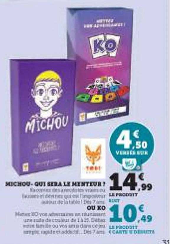 Découvrez l'offre de Michou - Qui Sera Le Menteur ! chez Hyper U! Cette offre fantastique est maintenant disponible dans le nouveau catalogue de Hyper U. Profitez de cette occasion et économisez considérablement sur votre achat.