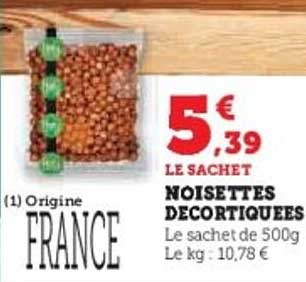 Provenant de France, ces noisettes décortiquées se présentent dans un sachet de 500g. Elles sont soigneusement sélectionnées pour garantir une qualité optimale. Le kg est affiché à 10,78 €, ce qui en fait un choix économique pour les consommateurs exigeants.