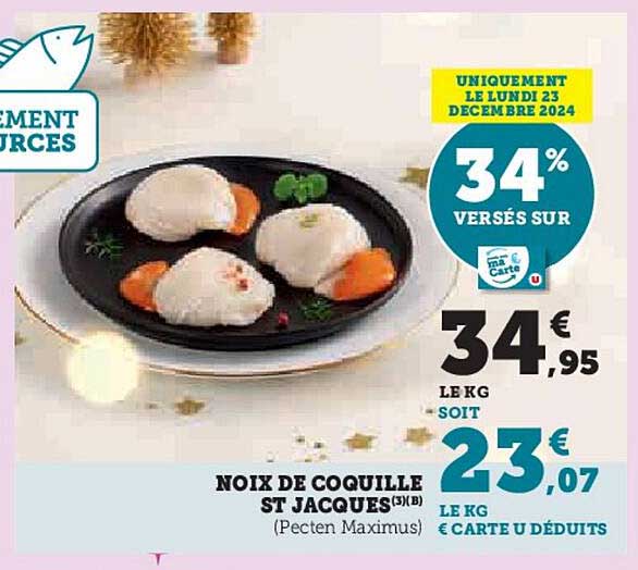 Découvrez dès maintenant la offre NOIX DE COQUILLE ST JACQUES (3)(B) dans le catalogue de Hyper U. Cette offre est valable du 17/12/2024 au 24/12/2024.