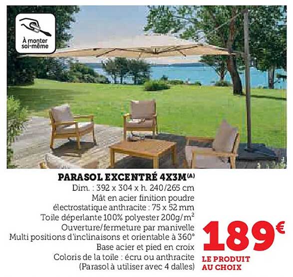 Découvrez dès maintenant la offre PARASOL EXCENTRÉ 4X3M(A) dans le catalogue de Hyper U. Cette offre est valable du 25/03/2025 au 21/04/2025.