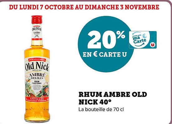 Découvrez l'offre de Rhum Ambre Old Nick 40° chez Hyper U! Cette offre fantastique est maintenant disponible dans le nouveau catalogue de Hyper U. Profitez de cette occasion et économisez considérablement sur votre achat.