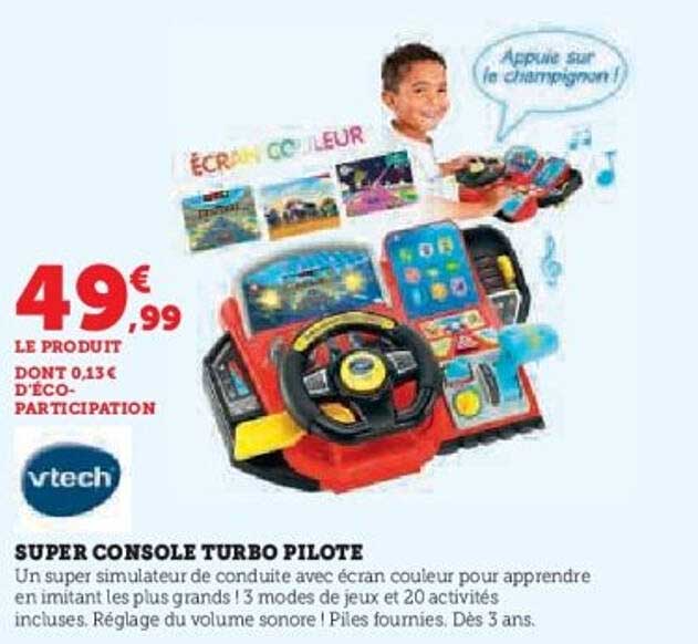Découvrez la SUPER CONSOLE TURBO PILOTE, un simulateur de conduite éducatif qui captivera les enfants dès l'âge de 3 ans. Avec son écran couleur et ses multiples fonctionnalités, cet article de Vtech permet d'apprendre en s'amusant. Voilà une offre idéale pour ceux qui cherchent à stimuler la curiosité de leurs petits tout en leur offrant des heures de jeu interactif.