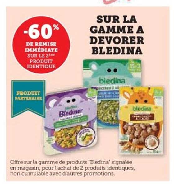 Vous cherchez à faire le plein de bonnes choses pour vos petits bouts ? Ne manquez pas cette incroyable offre sur la gamme à dévorer Bledina ! Du 4 au 16 novembre 2025, profitez de -60% de remise immédiate sur le deuxième produit identique. Une occasion en or pour rassembler toutes les saveurs que vos enfants adorent.