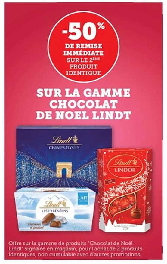 Noël approche à grands pas et avec lui, l'envie de partager des moments gourmands avec vos proches. Hyper U vous propose une offre exceptionnelle sur la gamme de chocolats de Noël Lindt. Pour l'achat de deux produits identiques, profitez d'une remise immédiate de 50% sur le deuxième ! Une occasion rêvée pour se faire plaisir sans vider son porte-monnaie.