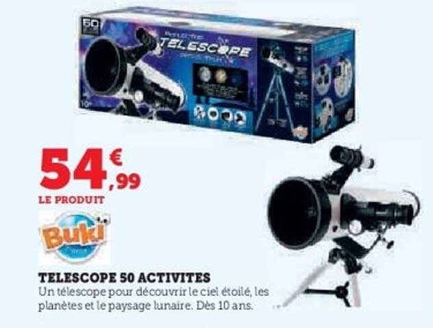 Découvrez l'univers fascinant de l'astronomie avec le Télescope 50 Activités de Buki. Ce télescope est spécialement conçu pour les petits curieux à partir de 10 ans, idéal pour explorer le ciel étoilé, les planètes et même les paysages lunaires. Avec cette offre, vous pouvez initier vos enfants à la science tout en leur offrant des moments de contemplation inoubliables.