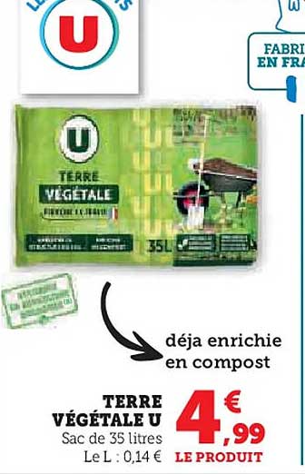 Si vous aimez jardiner, cette promotion est faite pour vous ! La terre végétale U est un indispensable pour nourrir vos plantes et garantir une belle floraison. Enrichie en compost, elle offre un apport nutritif optimal pour vos cultures. Disponibile au prix exceptionnel de 4,99 € le sac de 35 litres, c'est une offre à ne pas manquer !