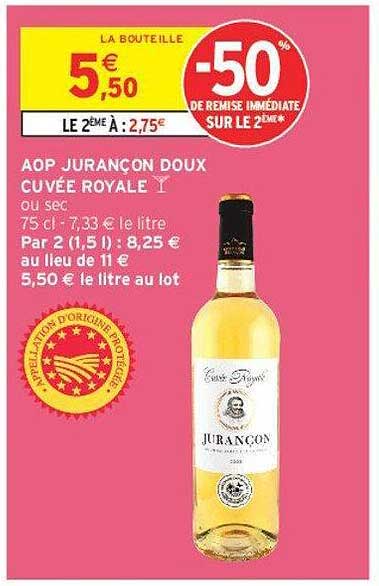 Découvrez dès maintenant la offre AOP JURANÇON DOUX CUVÉE ROYALE dans le catalogue de Intermarché Contact. Cette offre est valable du 08/04/2025 au 21/04/2025.