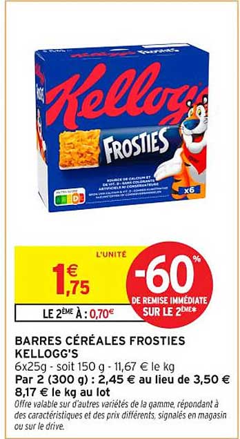 Découvrez les délicieuses barres céréales Frosties de Kellogg's, idéales pour les petits déjeuners et les collations. Avec leur goût irrésistible et leur texture croustillante, ces barres sont parfaites pour toute la famille. N'attendez plus pour profiter de cette offre incroyable valable jusqu'au 23 novembre 2025 !
