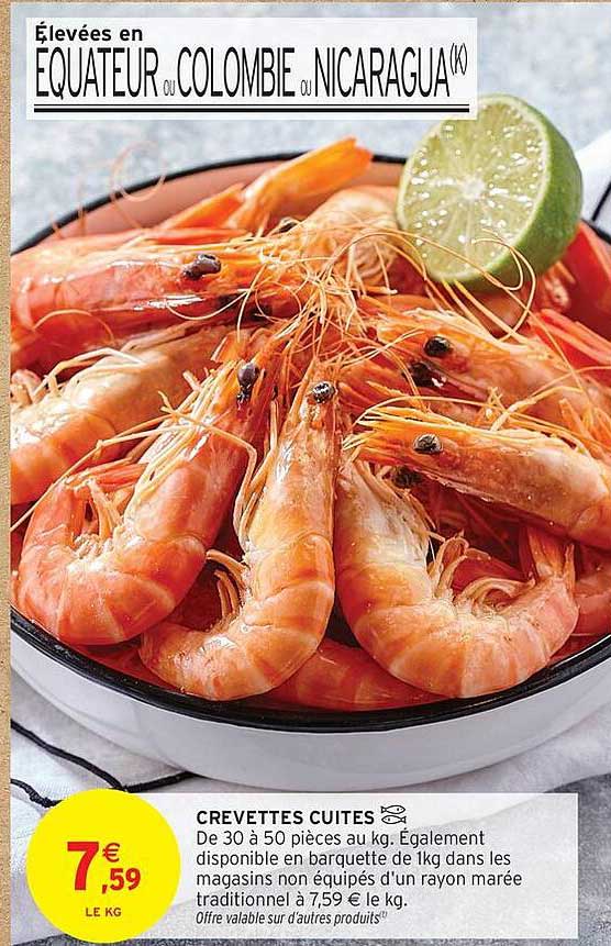 Découvrez les délicieuses crevettes cuites, une option à la fois savoureuse et pratique pour tous vos repas. Disponibles en 30 à 50 pièces par kilogramme, ces crevettes sont parfaites pour ajouter une touche marine à vos plats, que ce soit des salades, des pâtes ou des sushis. Profitez de cette offre exceptionnelle valable du 7 au 19 octobre 2025 et laissez-vous séduire par leur goût raffiné.