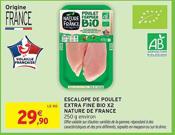 Offre de Escalope De Poulet Extra Fine Bio X2 Nature De France chez Intermarché Contact