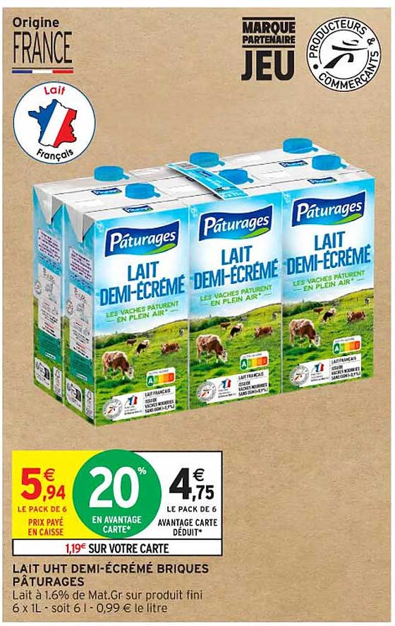 Offre de Lait Uht Demi-Écrémé Briques Pâturages chez Intermarché Contact
