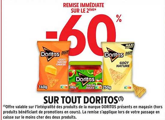 Vous êtes fan de chips et de snacks croustillants ? Ne manquez pas cette incroyable offre sur les produits Doritos ! Avec une remise immédiate de 60% sur le deuxième article, c'est le moment idéal pour découvrir ou redécouvrir vos saveurs préférées. Que ce soit pour un apéritif entre amis ou pour agrémenter vos soirées cinéma, Doritos est le compagnon parfait.