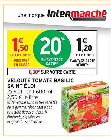 Découvrez une offre irrésistible sur le velouté tomate basilic de la marque Saint Éloi. Parfait pour les soirées d'hiver ou pour accompagner vos plats préférés, ce velouté est à la fois savoureux et nourrissant. À un prix réduit, c'est l'occasion idéale de faire le plein de saveurs dans votre cuisine.