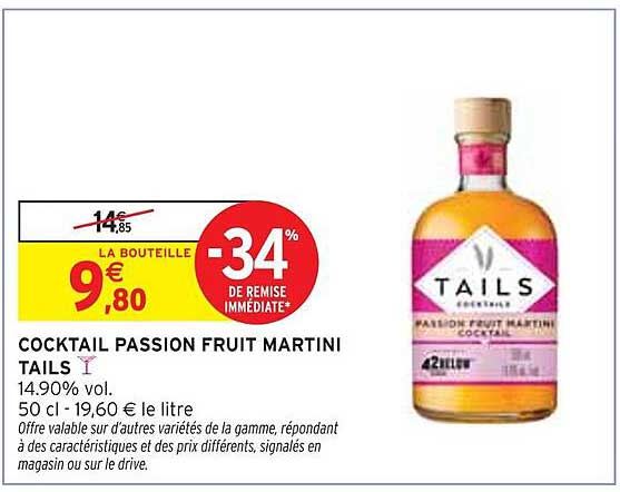 Découvrez l'offre de Cocktail Passion Fruit Martini Tails chez Intermarché Express! Cette offre fantastique est maintenant disponible dans le nouveau catalogue de Intermarché Express. Profitez de cette occasion et économisez considérablement sur votre achat.