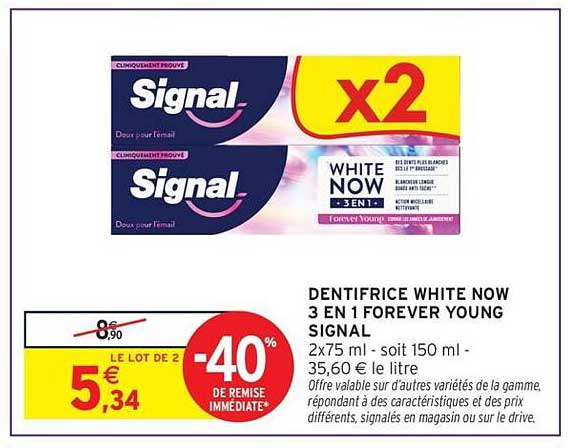 Découvrez une opportunité incontournable avec le dentifrice White Now 3 en 1 Forever Young de Signal, proposé à un prix incroyable. Cet article, connu pour sa capacité à blanchir tout en renforçant l'émail, est un choix judicieux pour ceux qui cherchent à prendre soin de leur sourire tout en réalisant des économies. Que vous souhaitiez une haleine fraîche ou une protection quotidienne, ce dentifrice répond à tous vos besoins.