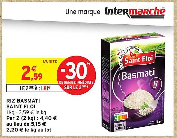 Découvrez l'offre de Riz Basmati Saint Eloi chez Intermarché Express! Cette offre fantastique est maintenant disponible dans le nouveau catalogue de Intermarché Express. Profitez de cette occasion et économisez considérablement sur votre achat.