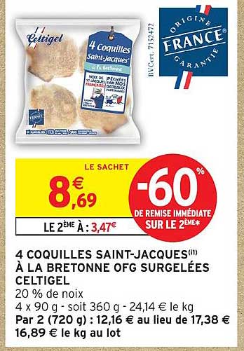 Découvrez l'offre de 4 Coquilles Saint-Jacques À La Bretonne Ofg Surgelées Celtigel chez Intermarché Hyper! Cette offre fantastique est maintenant disponible dans le nouveau catalogue de Intermarché Hyper. Profitez de cette occasion et économisez considérablement sur votre achat.
