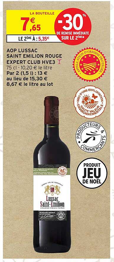 Découvrez dès maintenant la offre AOP LUSSAC SAINT EMILION ROUGE EXPERT CLUB HVE3 dans le catalogue de Intermarché Hyper. Cette offre est valable du 17/12/2024 au 24/12/2024.