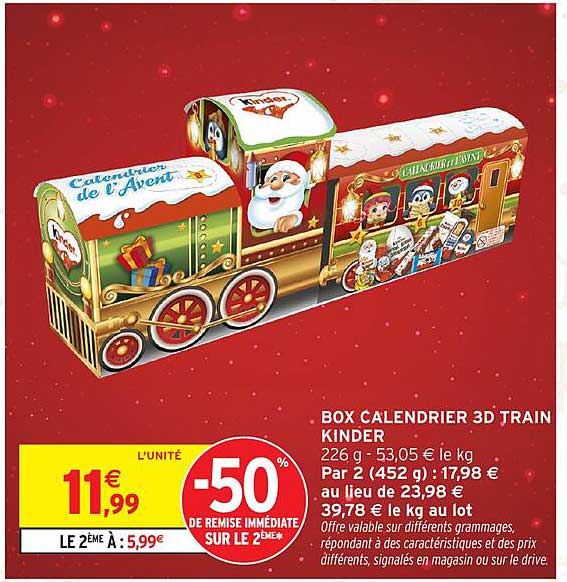 Découvrez l'offre de Box Calendrier 3D Train Kinder chez Intermarché Hyper! Cette offre fantastique est maintenant disponible dans le nouveau catalogue de Intermarché Hyper. Profitez de cette occasion et économisez considérablement sur votre achat.