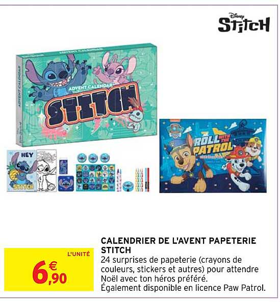 Découvrez dès maintenant la offre CALENDRIER DE L'AVENT PAPETERIE STITCH dans le catalogue de Intermarché Hyper. Cette offre est valable du 05/11/2024 au 17/11/2024.