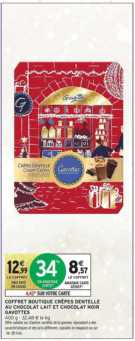 Découvrez dès maintenant la offre COFFRET BOUTIQUE CRÊPES DENTELLE AU CHOCOLAT LAIT ET CHOCOLAT NOIR GAVOTTES dans le catalogue de Intermarché Hyper. Cette offre est valable du 26/11/2024 au 15/12/2024.