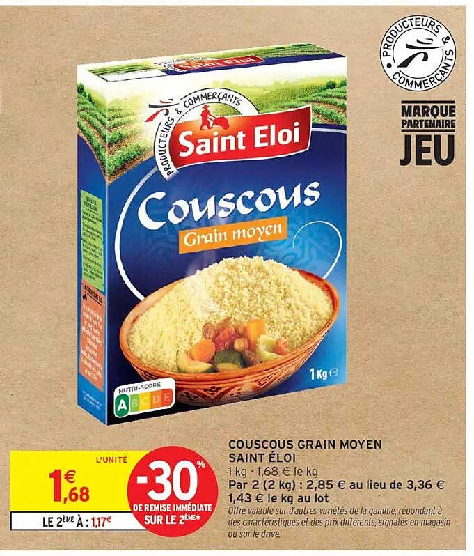 Découvrez dès maintenant la offre Couscous Grain moyen SAINT ELOI dans le catalogue de Intermarché Hyper. Cette offre est valable du 27/12/2024 au 05/01/2025.