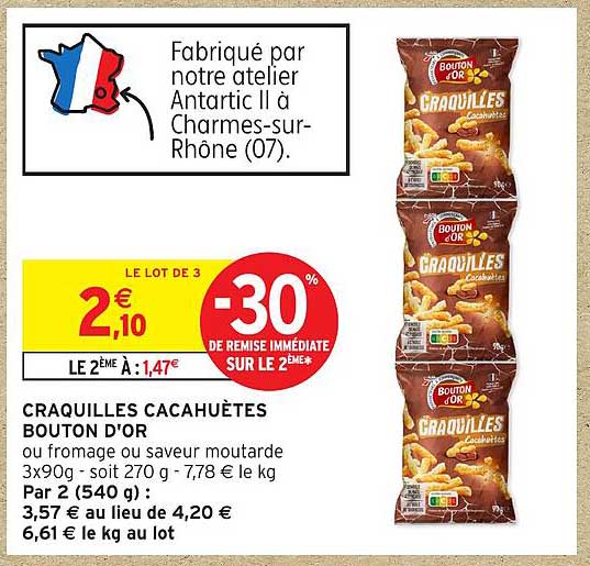 Découvrez l'offre de Craquilles Cacahuètes Bouton D'or chez Intermarché Hyper! Cette offre fantastique est maintenant disponible dans le nouveau catalogue de Intermarché Hyper. Profitez de cette occasion et économisez considérablement sur votre achat.