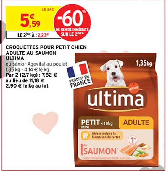 Offre de Croquettes Pour Petit Chien Adulte Au Saumon Ultima chez Intermarché Hyper