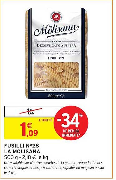 En ce moment, le prix des Fusilli N°28 est de seulement 1,09 €, soit une réduction de 34 % par rapport à leur prix habituel de 1,66 €. C’est l’occasion rêvée de les tester ou de les ajouter à vos recettes favorites. Ne manquez pas cette superbe offre !
