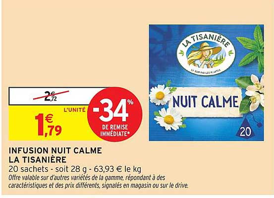 Découvrez dès maintenant la offre INFUSION NUIT CALME LA TISANIÈRE dans le catalogue de Intermarché Hyper. Cette offre est valable du 21/10/2025 au 02/11/2025.
