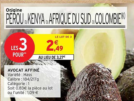 Profitez de cette offre exceptionnelle sur les avocats affinés ! En ce moment, Intermarché Hyper vous propose un lot de 3 avocats pour seulement 2,49 €, au lieu de 3,27 €. Une vraie bonne affaire pour les amateurs de saveurs et de cuisine saine ! Ces avocats, qui viennent du Pérou, du Kenya, d'Afrique du Sud ou de Colombie, sont parfaits pour vos recettes.