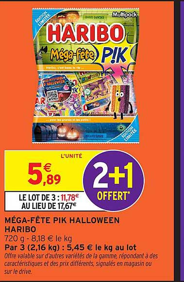 Pour tous les amateurs de sucreries, découvrez l'offre incroyable sur les bonbons HARIBO avec la MÉGA-FÊTE PIK HALLOWEEN ! Profitez de cette promotion spéciale qui vous permettra de remplir votre panier tout en vous amusant. C'est l'occasion idéale pour ajouter une touche festive à vos célébrations d'Halloween et ravir les petits comme les grands.