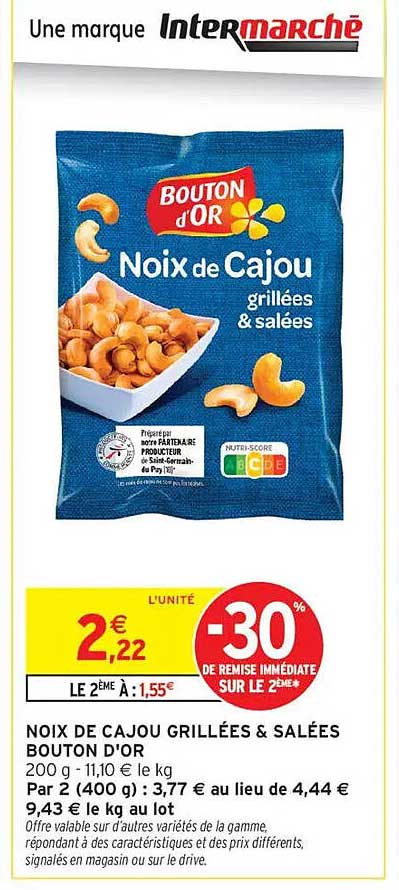 Les noix de cajou grillées et salées de la marque Bouton d'Or sont de véritables délices pour les amateurs de snacks sains. Disponibles chez Intermarché Hyper, ces noix sont une excellente option pour vos apéritifs ou simplement pour grignoter tout au long de la journée. Profitez de cette offre exceptionnelle, car elle vous permet de savourer un produit de qualité à un prix réduit.