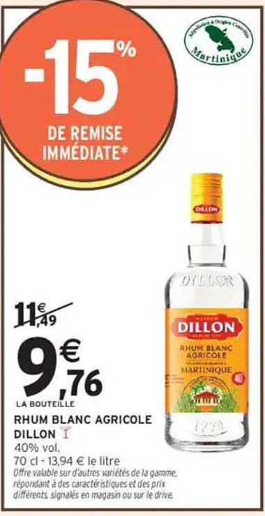Avec un prix habituel de 11,49 €, vous pourrez désormais vous procurer le Rhum Blanc Agricole Dillon à seulement 9,76 €. Une belle économie qui vous permet de goûter ce trésor des Antilles sans vous ruiner. Ne manquez pas cette opportunité de redécouvrir un classique à prix réduit !