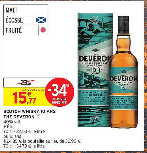 Découvrez l'offre de Scotch Whisky 10 Ans The Deveron chez Intermarché Hyper! Cette offre fantastique est maintenant disponible dans le nouveau catalogue de Intermarché Hyper. Profitez de cette occasion et économisez considérablement sur votre achat.