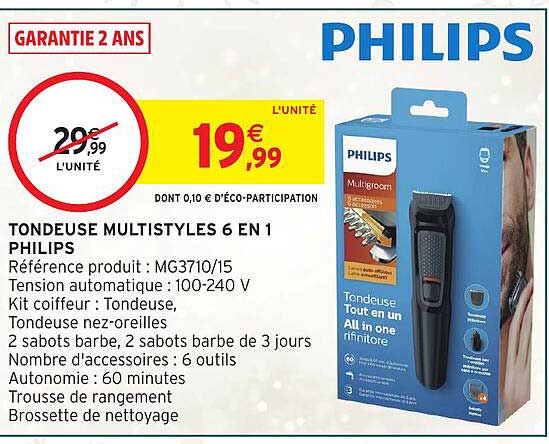 Découvrez la superbe offre de Tondeuse Multistyles 6 En 1 Philips dans le nouveau catalogue de Intermarché Hyper. En plus de cette offre, vous trouverez de nombreuses autres réductions attrayantes. Vous pouvez facilement commander le Tondeuse Multistyles 6 En 1 Philips en ligne via le site web de Intermarché Hyper ou l'acheter dans un magasin près de chez vous.