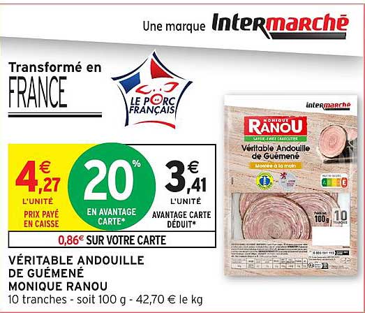 Découvrez dès maintenant la offre VÉRITABLE ANDOUILLE DE GUÉMENÉ MONIQUE RANOU dans le catalogue de Intermarché Hyper. Cette offre est valable du 04/11/2025 au 16/11/2025.