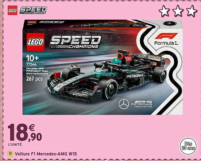Découvrez la magnifique voiture F1 Mercedes-AMG W15 dans la collection LEGO Speed Champions. Ce modèle, riche en détails, est parfait pour les fans de Formule 1 et les amateurs de briques LEGO. Avec 267 pièces à assembler, il promet des heures de plaisir créatif, idéal pour les enfants à partir de 10 ans et bien sûr, pour les adultes passionnés !
