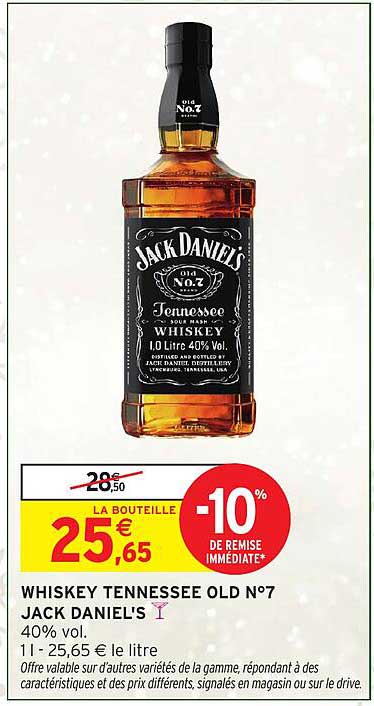 Découvrez la superbe offre de Whiskey Tennessee Old N°7 Jack Daniel's dans le nouveau catalogue de Intermarché Hyper. En plus de cette offre, vous trouverez de nombreuses autres réductions attrayantes. Vous pouvez facilement commander le Whiskey Tennessee Old N°7 Jack Daniel's en ligne via le site web de Intermarché Hyper ou l'acheter dans un magasin près de chez vous.