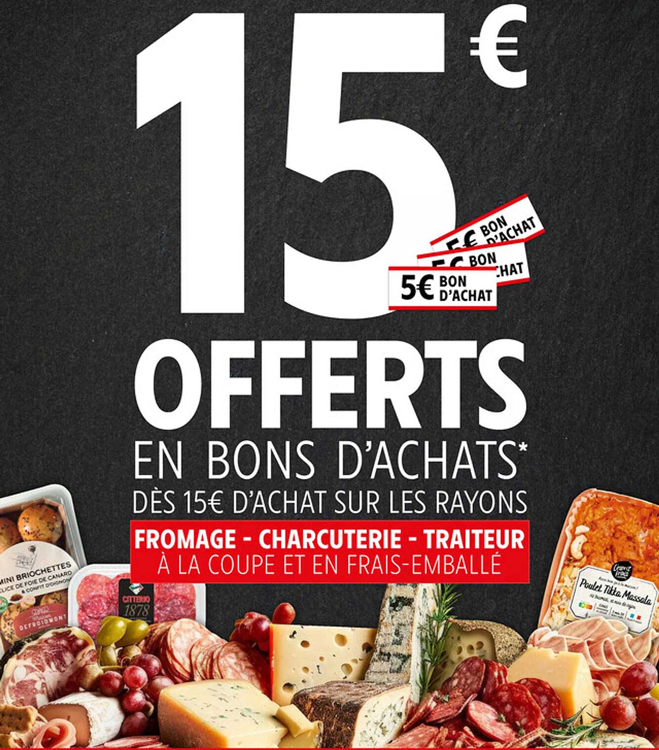 Découvrez le 15 € Offerts En Bons D'achats* Dès 15 € D'achat Sur Les Rayons Fromage - Charcuterie - Traiteur À La Coupe Et En Frais-Emballé