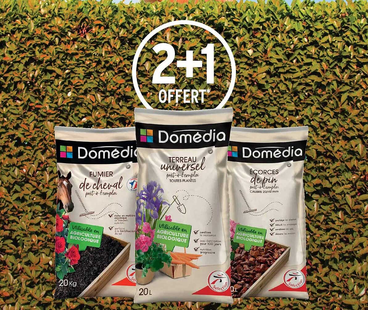 Vous cherchez à chouchouter votre jardin avec des produits de qualité ? Ne manquez pas l'opportunité exceptionnelle du catalogue Intermarché qui vous propose une offre alléchante sur les produits Domédia. Pour chaque deux sacs achetés de terreau, de fumier de cheval ou d'écorces de pin, le troisième est offert ! Une occasion rêvée de vous équiper sans vous ruiner.