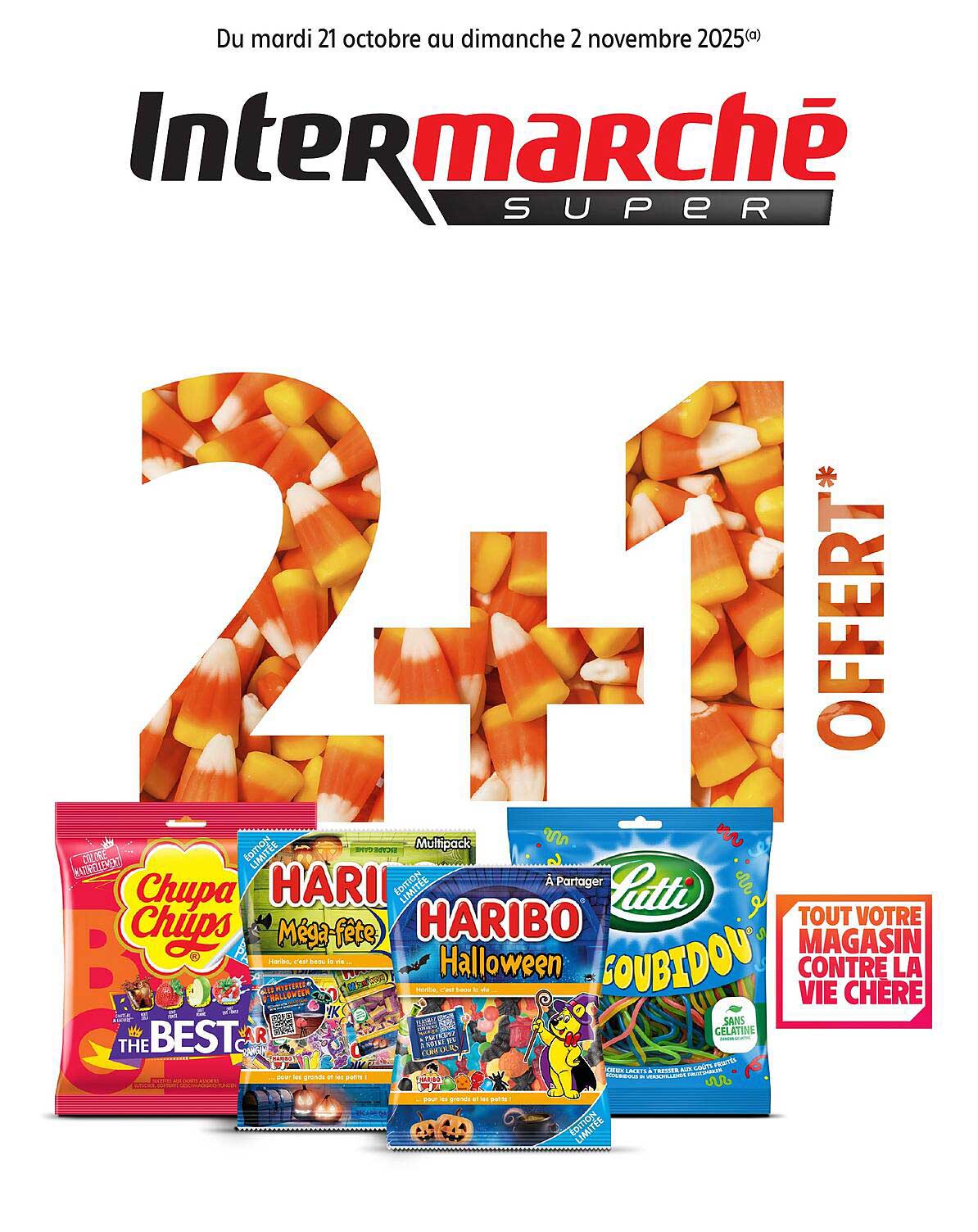 Intermarché vous propose une offre irrésistible sur une sélection de bonbons ! Du mardi 21 octobre au dimanche 2 novembre 2025, profitez de l'opération 2+1 OFFERT sur certains de vos bonbons préférés. C'est l'occasion idéale de faire le plein de douceurs pour vous et vos proches, et de vous régaler lors des fêtes d'Halloween et d'autres célébrations.