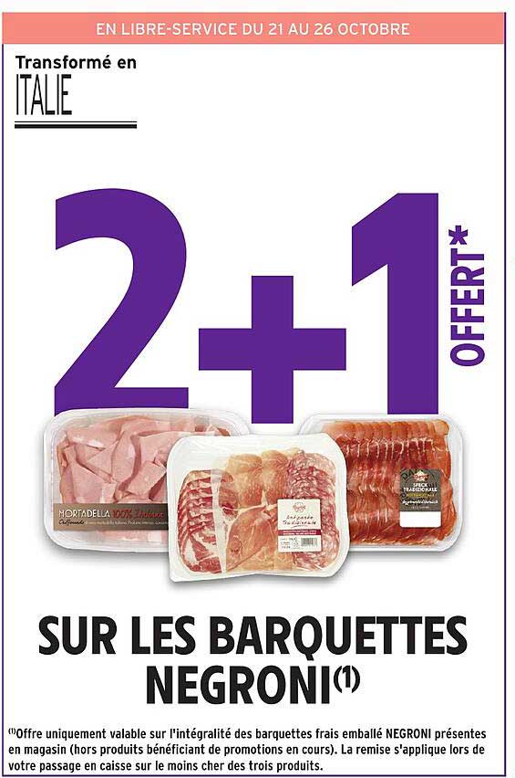 Découvrez une promotion exceptionnelle sur les barquettes Negroni, qui ravira les amateurs de charcuterie. Du 21 au 26 octobre, pour l'achat de deux barquettes, une est offerte ! Profitez de cette offre donnant la possibilité de savourer des produits italiens de haute qualité, tout en réalisant des économies non négligeables.