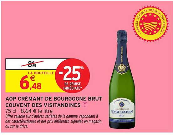 Découvrez dès maintenant la offre AOP CRÉMANT DE BOURGOGNE BRUT COUVENT DES VISITANDINES dans le catalogue de Intermarché. Cette offre est valable du 01/04/2025 au 13/04/2025.