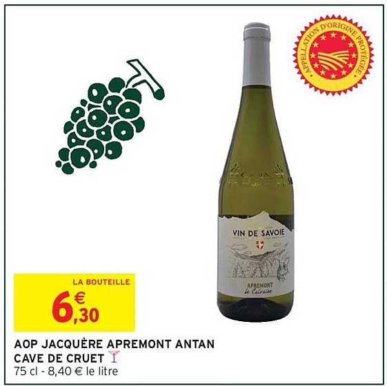 Découvrez dès maintenant la offre AOP JACQUÈRE APREMONT ANTAN CAVE DE CRUET dans le catalogue de Intermarché. Cette offre est valable du 30/09/2025 au 05/10/2025.