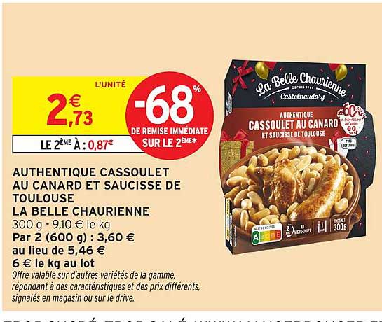 Découvrez la superbe offre de Authentique Cassoulet Au Canard Et Saucisse De Toulouse dans le nouveau catalogue de Intermarché. En plus de cette offre, vous trouverez de nombreuses autres réductions attrayantes. Vous pouvez facilement commander le Authentique Cassoulet Au Canard Et Saucisse De Toulouse en ligne via le site web de Intermarché ou l'acheter dans un magasin près de chez vous.
